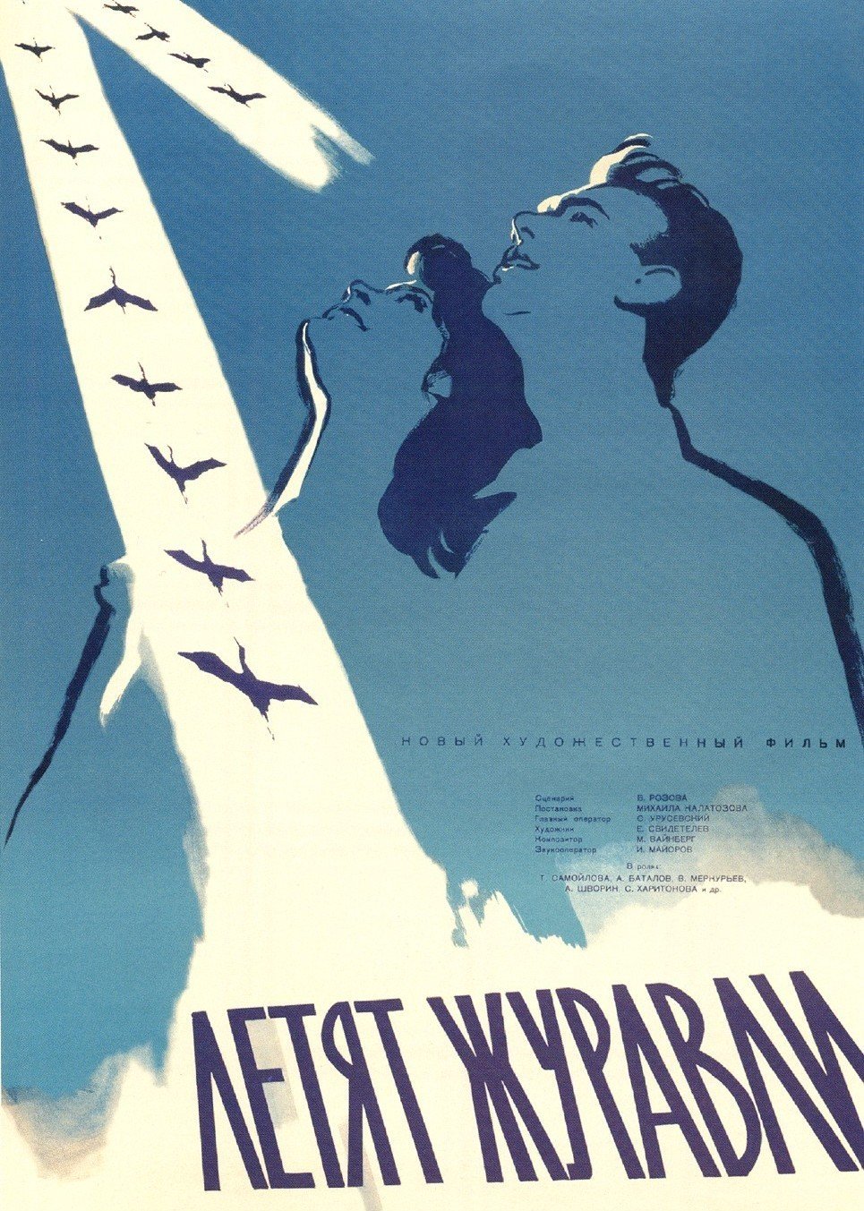 本部电影讲述身处硝烟弥漫的战争年代,一对热恋中男女青年的悲情爱情故eee。薇罗尼卡和鲍里斯本是沉浸在甜蜜热恋中的幸福情侣,可随着战争的爆发,这一切的美好即将破灭。鲍里斯参军,薇罗尼卡的父母在敌机的轰炸中双亡,悲痛欲绝的她只能寄宿在鲍里斯父亲的家中。鲍里斯的表弟趁机占有了她,薇罗尼卡受到众人指责。双重打击下的薇罗尼卡本想一死了之,可心中仍苦苦等待着鲍里斯的归来。当得知鲍里斯牺牲的消息后,薇罗尼卡彻底绝望了。战争结束,当所有人都在庆祝胜利的时候,薇罗尼卡也双手捧着鲜花来到广场上。这时,一行大雁在空中飞过,就像当初的美好时光一样。本片一经问世,就轰动了整个世界影坛,以其绝美的光影对比,绝佳的镜头运用,一举荣获1958年戛纳国际电影节金棕榈奖和摄影大奖。